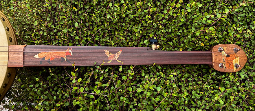 Details on the banjo: Walnut neck with two-toned steam bent walnut 3-ply 13 inch rim. There's an African mahogany rim cap, brass tacks, goatskin head for the pot. Indian rosewood fretboard with side fret markers all the way up the neck. Excellent Gotoh tuners and Aquila red strings. The inlay is various species of wood and all cut and done by hand.