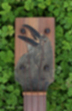 The Toad Banjo features a walnut neck, thick gourd, goatskin head, nylgut strings and Gotoh tuners. The inlay was done by hand of various woods with mother of pearl eyes. I did not grow this gourd because my crop did not do well this year, unfortunately.